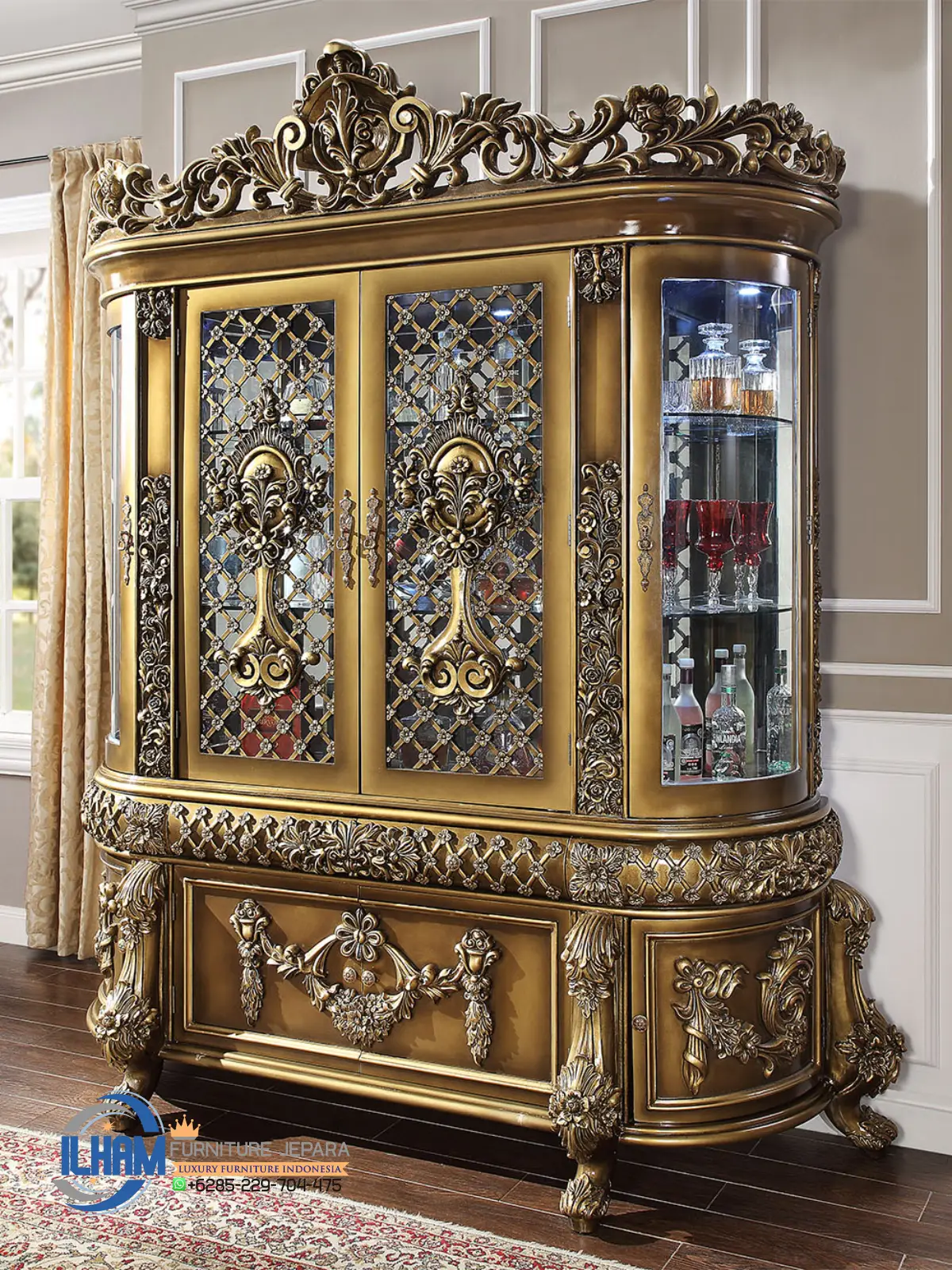 Lemari ini dilengkapi 2 pintu, menjadikannya ideal untuk menyimpan dan memamerkan koleksi barang pecah belah, kristal, atau aksesoris dekoratif. Kaca bening dan rak-rak kaca di bagian dalam semakin mempertegas kemewahan yang ditawarkan oleh ilham furniture jepara ini.
