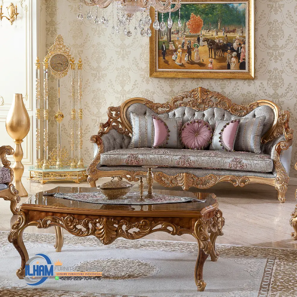 Pilihan sempurna untuk menambah keanggunan dan fungsionalitas pada Set Sofa Klasik Mewah Gold Classic Living Room rumah hunian jakarta bandung surabaya. Terbuat dari kayu berkualitas tinggi, sofa ini menggabungkan desain klasik dengan daya tahan yang luar biasa, memastikan keindahan dan kekuatan yang tahan lama.